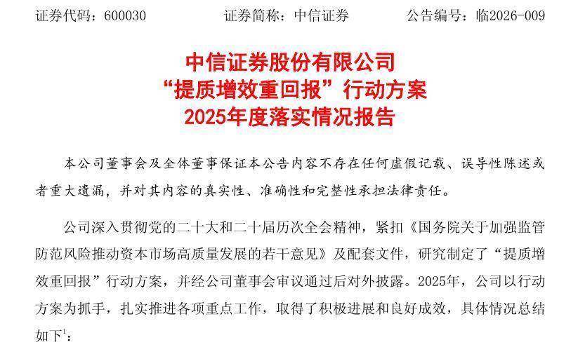 2月2日晚间,中信证券发布“提质增效重回报”行动方案2025年落实情况报告(简称“落实报告”),其中包含公司2025年业绩快报数据、对于“五篇大文章”的落实举措、落实“看门人”职责的情况以及分红情况等。
