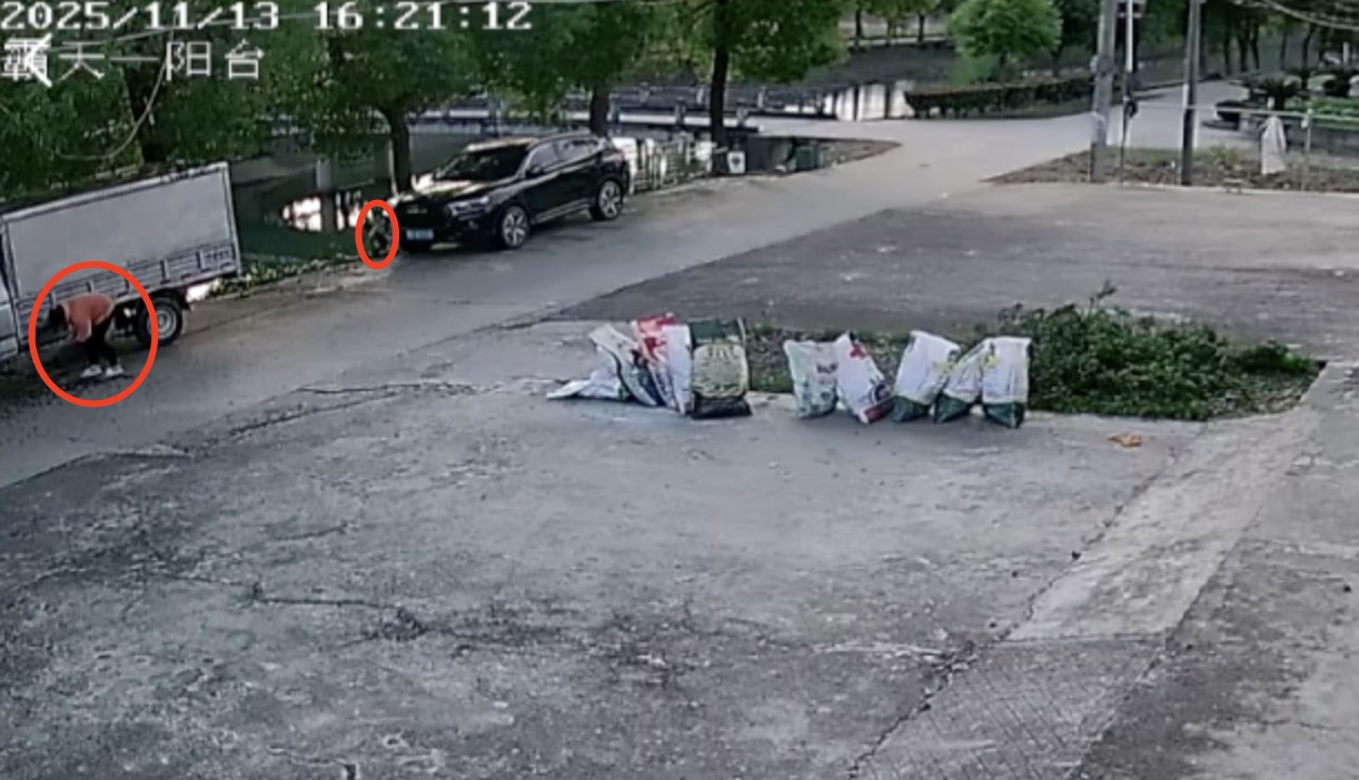 监控显示,龚某某的家临河而居,门口水泥地之外是通行的水泥路,路边种植着大樟树,树下停着一辆私家车和一辆小型厢式货车。11月13日下午16点15分,龚某某家门口收拾物品,孩子跟在后边,在水泥场地上转圈小跑,招呼妈妈去追他。