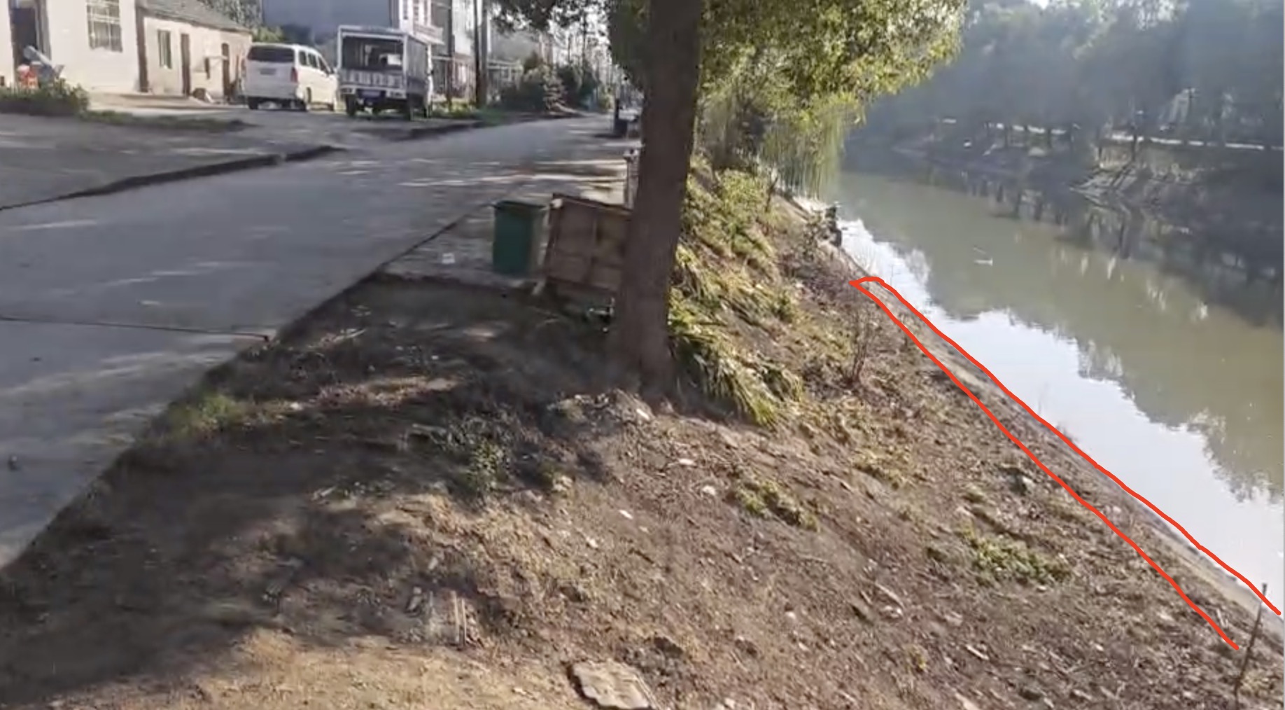家属事后拍摄的视频显示,龚某某家门口正对河道的路边,家里早些时候自行安装了一段不锈钢栏杆。路边土坡延伸向河道,下端是石砖铺设的护坡,半截淹没在水中。视频中,土坡坡度相对平缓,有村民坐在土坡上钓鱼,下半截的护坡则比较陡峭。